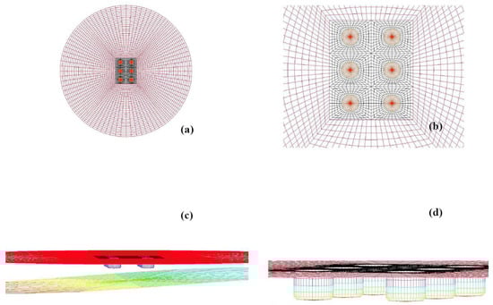Computational grid for a WEC array of 3 × 2 WECs: (a) plot of the whole mesh on the free surface, (b) zoom in the subregion of floaters, (c,d) 3D view of the mesh in the vicinity of the WECs.