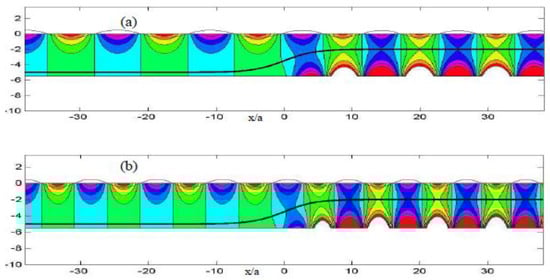 In the above studies the details of the wave field propagating and scattered over the variable bathymetry region could be important in order to consistently calculate the responses of the floating bodies. For rapidly varying seabed topographies, including steep bottom parts, local or evanescent modes may have a significant impact on the wave phase evolution during propagation. Such a fact was demonstrated through the interference process in one-directional wave propagation as observed for either varying topographies (see e.g., [,]) or abrupt bathymetries including coastal structures (see e.g., [,,]). For such problems, the consistent coupled-mode theory has been developed in [], for the water waves propagation in variable bathymetry regions. Furthermore, it was subsequently extended for 3D bathymetry in [], and applied successfully to treat the wave transformation over nearshore/coastal sites with steep 3D bottom features, like underwater canyons; see, e.g., [,].
