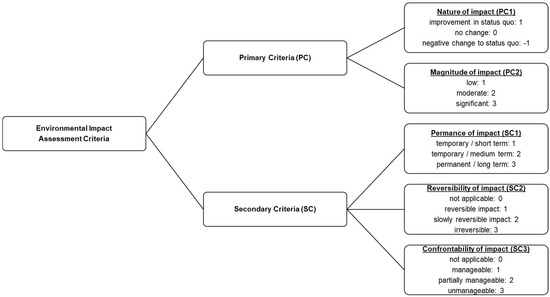 For implementing Step 3, specific environmental impact assessment criteria are taken into account, which are distinguished into: (i) Primary Criteria (PC) that include nature of impact (PC1) and magnitude of impact (PC2), and (ii) Secondary Criteria (SC) that include permanence of impact (SC1), reversibility of impact (SC2) and confrontability of impact (SC3). The scaling of these environmental impact assessment criteria is presented in Figure 1. Based on the scaling of this figure and inspired by the environmental score provided by [46], the impact significance of the project, akij, k = 1, 2, i = 1,…,3, j = 1,…,18, is calculated using the following equation: