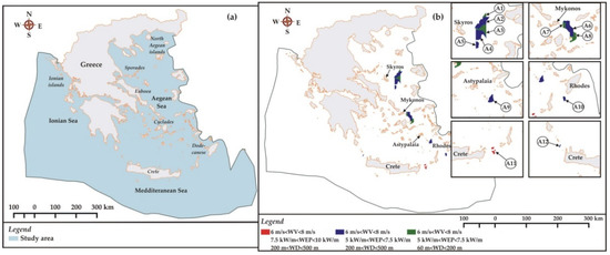 (a) Study area; (b) Eligible marine areas for Hybrid Offshore Wind and Wave Energy Systems (HOWiWaES) siting in Greece [41].
