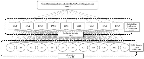 The identification of the most adequate site for HOWiWaES in Greece, as well as the preference order of eligible sites, are performed through AHP (Figure 3). AHP presents one of the most popular multi-criteria analysis methods on sustainable energy planning, since it is characterized by simplicity, flexibility and ability to consider in a common framework both quantitative and qualitative criteria [54,55].