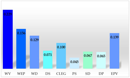 A total of 17 experts (approximately equal to 20% of the total sample) participated finally in this survey, by appropriately filling the comparison matrices of the evaluation criteria. Based on these matrices, the relative weights of the evaluation criteria with respect to the goal were calculated. These weights are shown in Figure 4. It can be seen that WV and WEP are the top two choices among the examined evaluation criteria, followed by EPV.