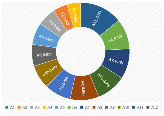 Considering the evaluation of alternatives A1–A12 with respect to the EVC1–EVC9 evaluation criteria, coupled with the involvement of the selection criteria as derived from the questionnaire survey, all alternatives are evaluated as shown in Figure 5. This figure illustrates the importance (percentage %) of the various alternatives in satisfying the primary goal (most adequate HOWiWaES siting) and forms the basis for the prioritization of the candidate sites.