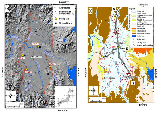 Figure 1. (a) Location and geography of the Aizu Basin. Relief map and elevation contour lines are drawn from the 50 m grid digital elevation map of the Geospatial Information Authority of Japan (GSI). The contour line interval is 10 m. The distribution of active faults is after Ikeda et al. [19] (b) Geological map of the Aizu Basin modified from the geological survey of Japan [20]. Yellow stars represent drilling sites of sedimentary cores shown in Figure 2. N-S and W-E lines represent the location of cross-sections shown in Figure 3 and Figure 4.
