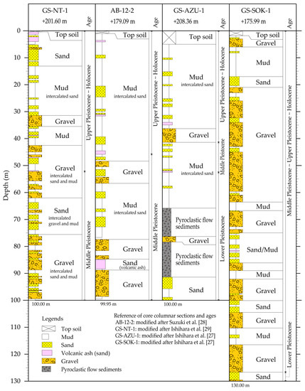 Figure 2 shows stratigraphic columns from four core samples. These columns illustrate that the shallow subsurface stratigraphy of the Aizu Basin is composed of gravel, sand, and mud strata. Pyroclastic flow sediments are found only in the GS-AZU-1 core located in the eastern margin of the basin. Occasional peat layers are also observed in some cores. The age of the core sediments was determined based on the chronological analyses including tephras (volcanic ashes and pyroclastic flow sediments) and radiocarbon dating [27,28,29]. All strata consist of Quaternary systems including the middle Pleistocene, upper Pleistocene, and Holocene. The lower Pleistocene is composed of pyroclastic flow sediment, gravel, sand, and mud layers and are found in only two cores in the eastern basin area. The middle Pleistocene consists mainly of gravel layers with intercalated sand and mud beds even though thick mud layers are found in the GS-AZU-1 and AB-12-2 cores. Thickness and distribution of intercalated sand/mud layers vary for each core, which indicates that these layers exist locally with poor continuity. In the upper Pleistocene and Holocene, mud layers are relatively dominant. Previous results of tephra analyses and radiocarbon dating indicate that thick mud layers from ca. 5 m to 20–50 m depth in each core were deposited during the same period [27,28,29].