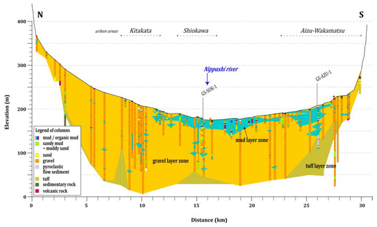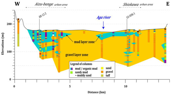 However, thick mud layers exist up to 20 m to 50 m depth from the surface in many boring and well logs from the central and western basin areas, Shiokawa, Aizu-Bange, and the eastern part of Aizu-Wakamatsu (around GS-AZU-1 core site) (Figure 3 and Figure 4). These layers match the core data, which indicates a shallow-depth distribution over the central floodplain areas except a region along the Aga River. Gravel sediments become dominant below 40 m depth around Shiokawa while mud sediments extend below 50 m around Aizu-Bange.