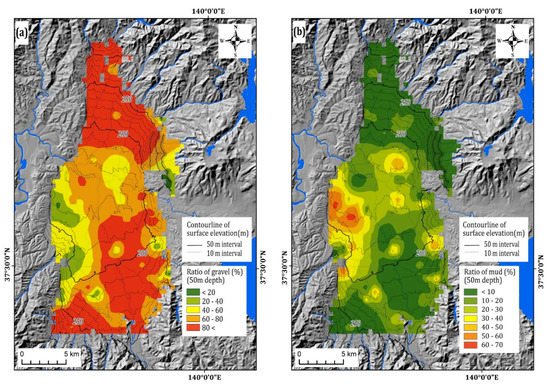 Figure 5. Ratio of (a) gravel and (b) mud layer up to 50 m depth. Relief map and elevation contour lines are drawn from the 50 m grid digital elevation map of the Geospatial Information Authority of Japan (GSI).