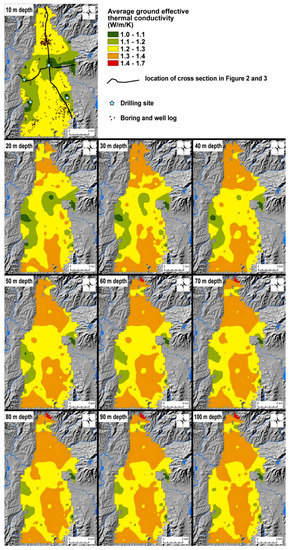 Values of the average ground and effective thermal conductivity are relatively high in the northern and southern basin areas, 1.3–1.4 W/m/K, and ranged from −20 m to −100 m depth. In the central and western areas, the average ground effective thermal conductivity shows lower values, which are approximately 1.0–1.3 W/m/K, but it tends to increase with depth. In the eastern margin of the basin, these values tend to be lower in the depth.