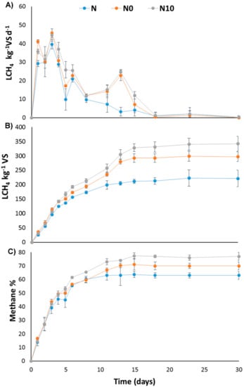 Methane production did not peak for the three assays N, N0, and N10 until the third day of BMP testing. The rate at which methane was produced spiked during the third day and it resulted in 39, 46, and 45 L CH4 kg−1VS day−1 for N, N0, and N10, respectively. As shown in Figure 1A, the first significant difference between N10 reactors and N and N0 reactors, was on the fifth day (t-student p < 0.05). N10 reactors resulted in higher methane production levels of 26 L CH4 kg−1VS day−1, whilst N and N0 reactors produced 17 and 10 L CH4 kg−1VS day−1, respectively.