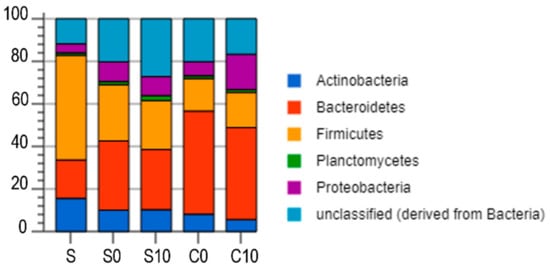 As shown in Figure 2, the four main bacteria phylum in all of the samples were Actinobacteria, Bacteroidetes, Firmicutes, and Proteobacteria. Firmicutes was the dominant phylum in S, comprising almost 50% of the total bacteria. In sludges S0 and S10, there was a lower percentage of Firmicutes, forming 26% and 25% of the total bacteria, respectively. Furthermore, the percentage of Firmicutes was even lower in C0 and C10, measuring 15% and 16%, respectively. In contrast, Bacteroidetes follows the opposite trend to Firmicutes. Bacteroidetes had its highest percentage in C0 and C10, attached to the carbon, reaching 48% in C0 and 43% in C10, while in S it accounted for 18% of the microbial community. The Proteobacteria phylum presented a difference between the samples: it was detected at 17% in the C10 biofilm; whilst, for the other samples, it never reached 10%.