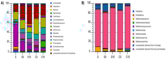 Bacteria (A) and Archaea community structure (B) at genus level. Genus level with relative abundance lower than 1% were included in unclassified groups. Sludge from control reactor (S), sludge from reactor with granular activated carbon (GAC) (S0), sludge from reactor with GAC biofilm developed before undertaking the BMP test (S10), GAC biofilm from reactor with GAC (C0) and GAC biofilm from reactor with GAC biofilm developed before undertaking the BMP test (C10).