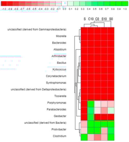 Heatmap of bacteria at genus level. Genus level with relative abundance lower than 1% were included in unclassified groups. Sludge from control reactor (S), sludge from reactor with granular activated carbon (GAC) (S0), sludge from reactor with GAC biofilm developed before undertaking the BMP test (S10), GAC biofilm from reactor with GAC (C0), and GAC biofilm from reactor with GAC biofilm developed before undertaking the BMP test (C10). Heatmap showing the 17 genera with significant difference of relative abundances among five samples. Heatmap is color-coded based scale (from red (−1) less abundance to green (+1) more abundance).