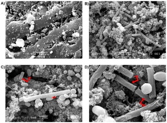 Through SEM, it was possible to examine the carbon surface and its porosity free of microbial communities before adding GAC to the reactors (Figure 5A). Additionally, microbial communities attached to GAC are clearly visible in Figure 5B. The exoelectrogen partner Geobacter was identified in the microbiological analysis attached to the GAC in sample C10 with a relative abundance of 14% in the bacterial community. Geobacter has been described as rod-shaped bacteria with a length between 2–4 µm []. In Figure 5C, bacteria can be visualized with the same morphological characteristics described above. This, coupled with the high percentage of Geobacter attached to GAC, makes it plausible to identify them in the Figure 5C. Methanosaeta is a rod-shaped archaea with average dimensions between 2 and 6 µm in length by single cell. Cells are enclosed inside an annular, striated sheathed structure, and they are separated by partitions forming a filamentous structure. Methanosaeta filaments can reach 100 µm of length []. In Figure 5D, it is possible to see Methanosaeta communities. Besides Methanosaeta was the dominant archaea in the microbial communities analysis, making its identification easy by SEM.