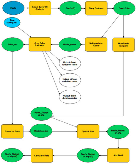 The SOLIS model is based on a multipatch feature, namely 3D vector data of roofs of buildings. The multipatch feature is a separate GIS object, which represents a 3D object by a collection of patches. In the model, every surface of a geometrically complex roof is referred to as a separate patch. The multipatch feature is characterised by a Z-value, which represents the height of each patch [33] by a minimum height (Min Z of geometry) and a maximum height (Max Z of geometry). The Min Z and Max Z allow for the calculation of all the analysed objects with a slope designation to all of them. The height value, as well as the surface area of the roofs, are required as input data for the presented SOLIS model. It was decided to limit the model to the minimum value of the roof surface area of the patches. Based on the average size of the photovoltaic panel, which is approximately 2 m2, it was decided that smaller patches that are included in the calculation need to have minimum surface are of 2 m2 as well. This data filtration enables to focus not only on surfaces that might be economically suitable, but also allows for the exclusion of outliers in datasets, caused by mistakes in data processing. Subsequently, the height value of multipatch objects allows for the creation of a raster of roofs, which was a basis for subsequent calculations of the solar radiation.