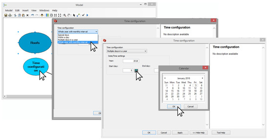 While using SOLIS, the user is requested for two things. Firstly, it is necessary to show the location of the input data. The input data format is an Esri shapefile in a multipatch geometry, as described in Section 2.1. Once the input data is defined, the second question to the user is the time for which solar radiation should be calculated. The available options are to calculate solar radiation per: (1) special days; (2) within a day; (3) multiple days in a year; or (4) whole year with a monthly interval. Obviously, the weather conditions on exact dates are unknown [37]. However, in order to support investment decisions, mean values are detailed enough, as the approximate radiation would describe general conditions for solar energy production in sufficient detail for practical use. The layout of the SOLIS interfaces is presented in Figure 2 and Figure 3.