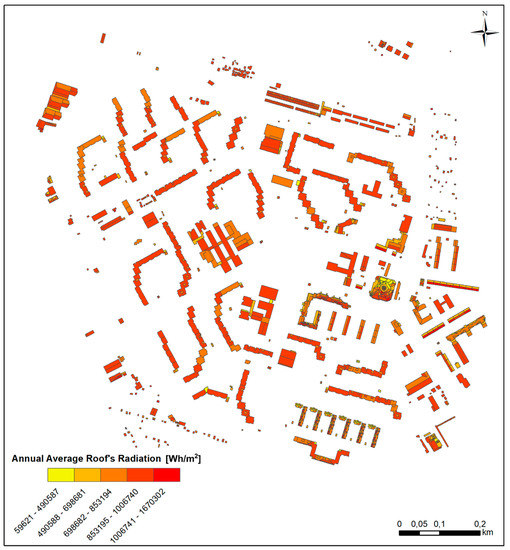 The proposed approach has some limitations that have to be highlighted. Firstly, as the model is based on the digital model of the surface (in this case roofs), it does not take into account the weather conditions that have a significant impact on the actual solar radiation [47]. This aspect may increase due to future climate change and a constantly increasing amount and duration of periods with extreme weather [48,49,50,51]. As Ohunakin et al. [48] presented, considering future changes of solar radiation is a common element in the recent studies on the effect of climate change on solar radiation. It cannot be denied, the climate changes are already well proven in the literature [49], and their implications to the economic development are severe [51]. Besides the limitation of external conditions, there is a limitation that is caused by the data source itself. Nowadays, it is quite common that local authorities have access to digital terrain models, including a detailed information about the roof geometry [52,53]. However, not all urban 3D models contain information on greenery. Therefore, the analysis includes only the shading effect of other objects that are defined in the input data. In the case of the two tested samples only, buildings were included, as the tested neighbourhoods got buildings exceeding the height of any existing greenery. However, for other study areas, this aspect should be taken into account.