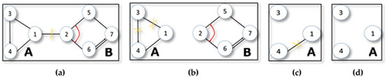 As shown in Figure 2a, node 1 represents the target component to be recycled and needs to be detached from the graph. Firstly, the cut nodes are located to identify the subassembly. In this case, node 1 itself and node 2 are both cut nodes. There is an undirected edge between them which means some kind of constraint. Once the edge is removed, the graph is divided into two subgraphs (Figure 2b). Since the target node 1 is in subassembly A, the subassembly B can be simply put aside.