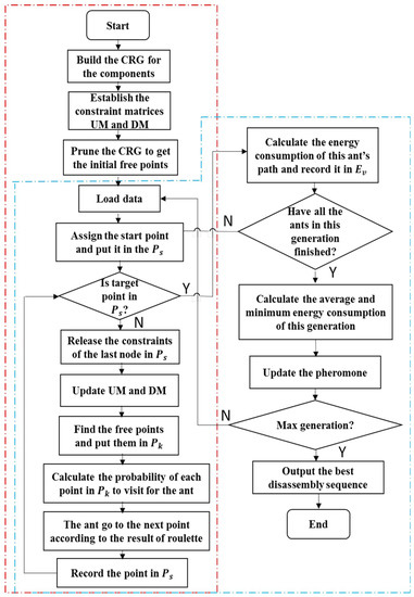 Repeat the above process and the best disassembly sequence containing the target component aiming at lowest energy consumption will be found. The architecture of the proposed method combining CRG and IACO is summarized in Figure 3. The content inside the red dotted line is the process about establishment and pruning of the CRG and the content inside the blue dotted line is the process about using the IACO to get the best disassembly sequence.