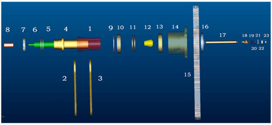 For the ease of illustration, the target component and its associated components are numbered in Figure 5. The disassembly tool and operation direction are listed in Table 1. Take the target component as the center and analyze the constraints relationship of its surrounding components, then draw the first step of CRG. Based on this, the second step is carried on and the free nodes are found (Figure 6a,b). The process is repeated until the subassembly containing the target component is identified (Figure 6c–e). Finally, a subassembly with 14 components which is much simpler than the original machine is obtained. Its boundary points are all free nodes, that is, the disassembly can be removed from the product as an entirety.