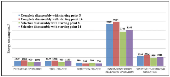 The energy consumption of the complete disassembly is higher than that of the selective disassembly. Table 5 shows the comparison between them. The subassembly contains 14 components and the selective disassembly requires only 11 of them to be disassembled to obtain the target component. That is, the other three components can be disassembled as an entirety without releasing the inner-connections between them. The selective disassembly saves 2556 J and 2734 J energy compared to the complete disassembly with starting point 8 and 14, respectively. The detailed comparison in Figure 8 indicates that the selective disassembly can reduce energy consumption in different aspects of the disassembly process.