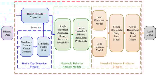 For a single household, energy consumption is often determined by the residents’ living habits, but their behavior is accompanied by a certain degree of randomness due to various factors, including external environmental factors and family internal factors [23]. External environmental factors mainly concern the weather conditions, types of weekdays, emergencies, etc., and family internal factors mainly contain family members’ types, income statuses, and so on. Generally, similar factors will have similar effects on the consumption of household appliances. Therefore, it is feasible to model household consumption behavior with the statistical characteristics of appliance consumption in similar historical days. Accordingly, a forecasting framework of group household consumption is proposed based on historical similar day selection and probability statistics, as shown in Figure 1. The similar day extraction module is used to evaluate the influence of external environmental factors and family internal factors on the electricity consumption of residents. A household behavior analysis module is used to analyze the switch states of household appliances in the past, reflecting the residents’ decisions about the behavior of appliances. The household behavior prediction module is responsible for the prediction of group households in the forecasting day.