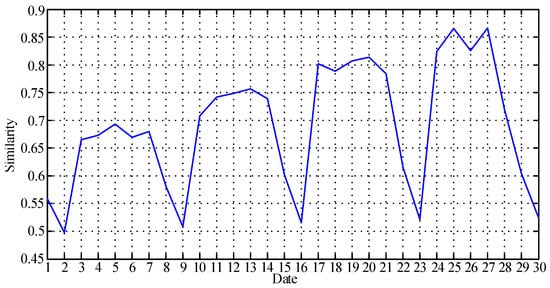 One household in the community was selected for the prediction of energy consumption for 31 July 2017 with the historical data. The partial household appliances in this family are shown in Table 1. Based on the collected data, the degree of similarity among the historical days and forecasting day in July is shown in Figure 2. From the figure, one can see that the 5 days with the highest similarity degree were 27 July with 0.86658, 25 July with 0.86534, 26 July with 0.82582, 24 July with 0.82448, and 20 July with 0.81342. According to the 5 extracted similar days, the energy consumption of this single household for July 31 was predicted.