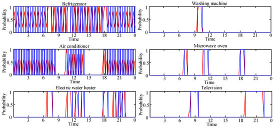 The electricity consumption behavior for household appliances on 31 July 2017 was predicted based on the similar historical days, and Figure 3 shows the working probability of six common household appliances at each sampling point. In the figure, the red curve is the predicted working probability of household appliances, and the blue curve is the actual working probability of household appliances. One can see that the predicted probability for these appliances is very similar to the actual working condition. For example, the refrigerator’s working condition is relatively stable, and it rotates between work and standby modes for 24 h. According to the predicted result, the refrigerator has a relatively long-running operation from 6:50 h to 7:20 h, between 10:40 h and 11:20 h, and between 17:40 h and 18:10 h, which is the same as the actual situation. It can be judged that this household uses the fridge frequently in each meal time period. In the prediction result, the air conditioner is in operation from 0:00 h to 8:00 h, from 10:10 h to 13:30 h, and from 17:30 h to 24:00 h, while the actual working condition of the air conditioner is from 0:00 h to 8:00 h, from 10:30 h to 13:40 h, and from 17:40 h to 24:00 h. One can see that there is a better forecasted result in the early morning and evening periods, and the overall prediction accuracy in the noon is up to 85%. Similarly, the forecasted results for the electric water heater, washing machine, microwave oven, and television also high overall prediction accuracies.