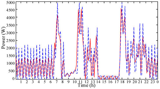 Based on the predicted results of all household appliances, the expected daily power of this household was obtained. Figure 4 shows the comparison result between the expected power and the actual power of this single household. From the red curve, one can see that the main consumption time for the household is from 6:30 h to 8:00 h, from 10:20 h to 11:50 h, from 17:30 h to 18:30 h, in which peak consumption is at 17:50 h with 4556 W, 11:00 h with 4520 W, 7:10 h with 4120 W, and off-peak consumption is from 8:30 h to 10:00 h and from 14:00 h to 17:40 h with about 200 W. Based on the actual profile in blue color, the comparison result shows that prediction error of peak consumption in the morning was 16.26%, at noon it was 7.39%, and in the evening it was 7.39%, and the prediction accuracy for the determination of peak consumption was 10 min. Therefore, the prediction results are in good agreement with the measured data, and can accurately predict each peak and valley time. Additionally, from 0:00 h to 8:00 h, due to the operation characteristics of the air conditioner, the expected power is different from the actual power, but the expected energy consumption is the same. Similarly, the time interval from 22:30 h to 24:00 h still has the same result.