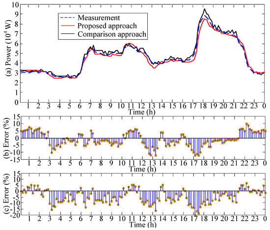 Prediction results for the residential community: (a) is the forecasting power; (b) is the error between the proposed approach and the measurement; (c) is error the between the comparison approach and the measurement.