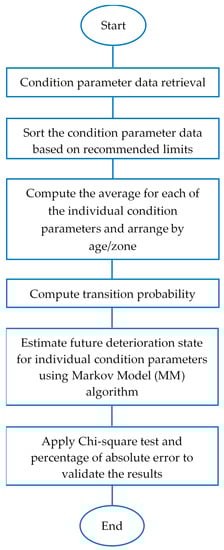 Markov process is used in non-time variant statistical deterioration prediction modelling. Markov chain is commonly used in civil engineering especially for structural deterioration assessment such as buildings [23], bridge [24], bridge element [25], pavement [26] and storm water pipe [27]. Markov chain also has been utilized to assess the oil degradation in oil-filled switchgear [28] and to determine spare requirement for power transformers [29,30].