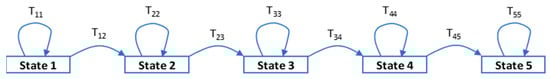 A typical MM for facilities deterioration based on [33] is shown in Equation (1). The transition probability matrix describes the probability of transitioning states within each time interval,
