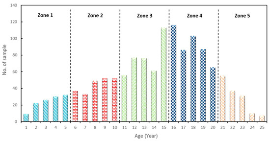 In total, 1322 oil samples from 373 distribution transformers with voltage and power ratings of 33 kV and 30 MVA were analysed. The range of age for the transformer population is between 1 to 25 years. In total, the oil samples were clustered into 5 zones of age as shown in Figure 3.