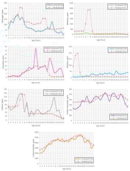 Comparison between computed and predicted hydrogen, methane, acetylene, ethylene, ethane, carbon monoxide and carbon dioxide.