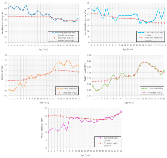Comparison between computed and predicted dielectric breakdown voltage, interfacial tension, colour, acidity and water content.