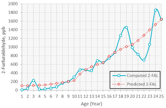 The majority of predicted values for dielectric breakdown voltage, interfacial tension, colour, acidity, water content and 2-FAL are observed to fall close to the computed values which indicate consistency to the hypothesized distribution as shown in Table 5.