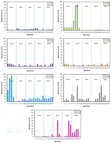 where is the computed individual condition parameter, is the predicted individual condition parameter, and is the age of the transformer. The computed average percentage error for individual condition parameter and accuracy levels are tabulated in Table 5 and Table 6, respectively. The highest average percentage error in zone 1–5 is C2H4 and the lowest is H2 for a period of 25 years as shown in Table 6. Zooming into zone 3–5, the highest average percentage error is C2H2 and the lowest is CO2. In term of accuracy level, CH4 has the highest accuracy followed by H2, CO, CO2, C2H4, C2H6, C2H2. The distribution of absolute percentage errors for H2, CH4, C2H2, C2H4, C2H6, CO and CO2 are shown in Figure 7.
