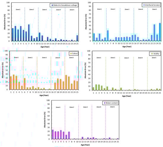 Percentage of absolute error between computed and predicted dielectric breakdown voltage, interfacial tension, colour, acidity and water content.