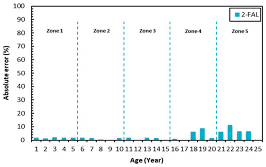 Colour has the highest average percentage error in zone 1–5 followed by dielectric breakdown voltage, interfacial tension, water content, acidity and 2-FAL for a period of 25 years as shown in Table 7. In zone 3–5, the highest and lowest average percentage errors are colour and acidity. Acidity has the highest accuracy while colour has the lowest accuracy. Figure 8 and Figure 9 show the distribution of absolute percentage errors for dielectric breakdown voltage, interfacial tension, colour, acidity, water content and 2-FAL.