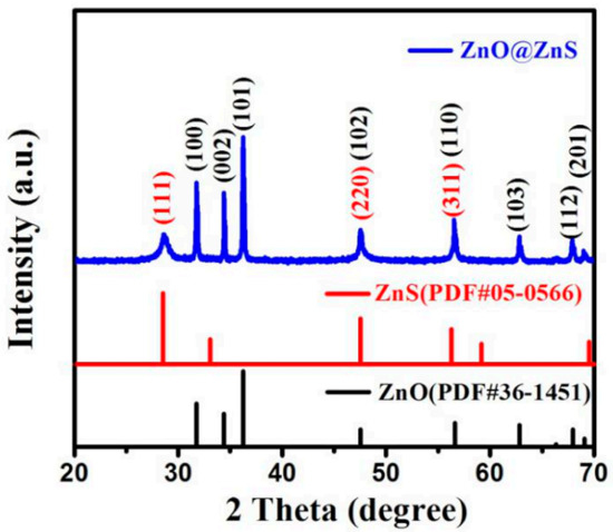 XRD patterns of the ZnO@ZnS nanorods are presented in Figure 1. It contains obvious peaks of ZnO and ZnS, the peaks at 31.8°, 34.5°, 36.2°, 47.5°, 56.5°, 62.8°, 67.9° and 69.1° match well with (100) (002) (101) (102) (110) (103) (112) and (201) planes in hexagonal ZnO (JCPDS file 36-1451), respectively. The peaks at 28.6°, 47.5° and 56.5° can be assigned to (111) (220) and (311) planes in ZnS (JCPDS file 05-0566), respectively. No other impurities have been detected. Therefore, the synthesized composite material has high-phase purity and excellent crystalline structure.