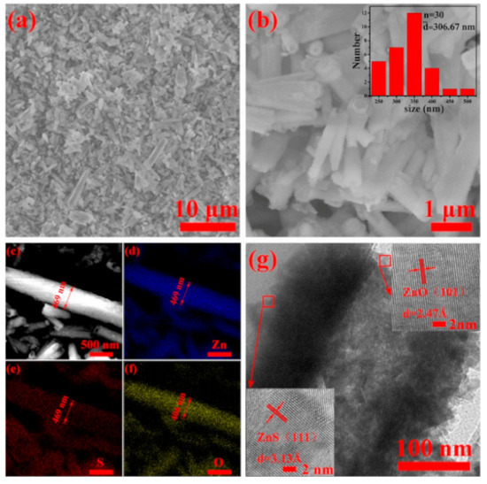 (a,b) SEM images of the ZnO@ZnS nanorods at different magnifications and the particle-size distribution of the ZnO@ZnS nanorods; (c–f) energy-dispersive X-ray spectroscopy (EDS) mapping showing the distributions of zinc (Zn), sulfur (S) and oxide (O) in the ZnO@ZnS nanorods; (g) TEM images of the ZnO@ZnS nanorods at different magnifications.