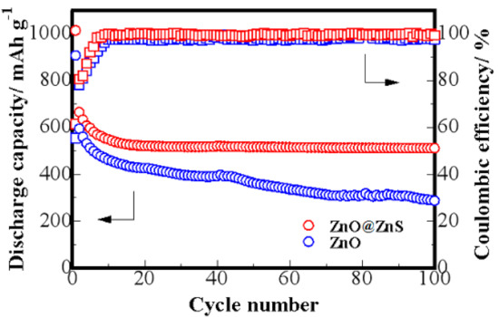 In this work, the electrochemical performance was evaluated using coin-type cells (CR2032). The working electrodes were fixed with 80% ZnO@ZnS nanorod powder, 10% super P (Shanghai SIMBATT Energy Technology, Shanghai, China, 99.5% purity) and 10% polyvinylidene fluoride (PVDF, Kynar, HSV900). Then, the batter was dispersed on the copper foil and the treated copper foil was pierced into disks whose diameter was 15 mm. Then, 1.0 M LiPF6/EC + DMC + DEC + EMC (1:1:1:3, v/v) was used as the electrolyte. The ZnO@ZnS nanorod electrode, Celgard 2400 separator, and a lithium foil electrode were assembled into a button battery in a glovebox in an argon (99.9%) environment. The multichannel battery test (BTS-5V5 mA; Neware, Shenzhen, China) was used to test the electrochemical performance at different current densities at a cut-off potential window of 0.01–3.0 V versus the Li+/Li electrode.