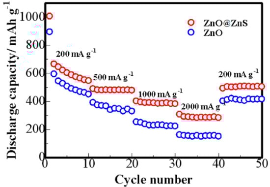 The rate capabilities of the pure ZnO and ZnO@ZnS nanorods are characterized at different current densities and the results are shown in Figure 4. The ZnO and ZnO@ZnS electrodes exhibit specific discharge capacities of 463.2 (553.3), 330.2 (490.4), 225.5 (385.6) and 157.2 (291.7) mAh g−1 at a current density of 200 mA g−1, 500 mA g−1, 1000 mA g−1, and 2000 mA g−1, respectively. The significant improvement in the rate capability of the ZnO@ZnS electrode over the ZnO electrode can be clearly seen. Furthermore, the ZnO@ZnS electrode holds a discharge specific capacity of 291.7 mAh g−1 at a high current density of 2000 mA g−1. However, the discharge capacity of the electrode is restored back to 513.3 mAh g−1 when the current density is restored to 200 mA g−1. This allows us to conclude that the ZnO@ZnS nanorod electrode has a good rate performance. The excellent performance can be ascribed to its unique core-shell structure, which improves structural flexibility for buffering the volume variation during the Li+ intercalation/de-intercalation. The nanorod morphology also facilitates the insertion and extraction of lithium ions due to its shorter pathways for the diffusion of lithium ions.