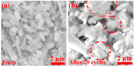 To observe the stability of the ZnO@ZnS nanorod after the electrochemical test, the SEM images of the fresh electrode and one after 20 cycles are shown in Figure 6. Some partial agglomerations have happened after cycling, which will lead to the separation of the ZnO@ZnS nanorods from the conducting agent and reduce the battery performance [24]. However, most of the ZnO@ZnS nanorods still present complete structures, indicating its structural stability upon electrochemical cycling.