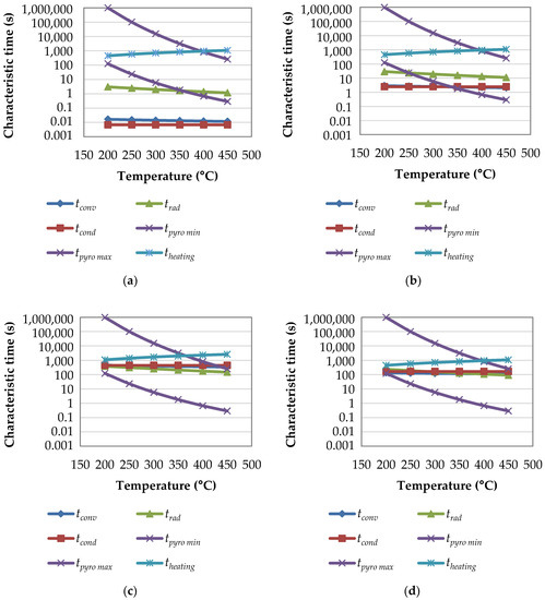 Characteristic times of the pyrolysis step as a function of temperature for: (a) particle scale in TGA conditions; (b) bed scale in TGA conditions; (c) bed scale in device M conditions; and (d) bed scale in device P condition. TGA: thermogravimetric analysis.