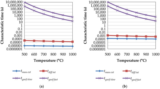 In this study, characteristic times were calculated for char preparation through pyrolysis and for steam gasification of the char to represent the chosen experimental procedure as closely as possible in which the two reactions occur one after the other. Analysis of the characteristic times of the pyrolysis step is important since, if other phenomena than the chemical reaction occur, it could result in the production of different chars in the different conditions. Since char is the starting material to gasification, it could mean that these chars would behave differently during gasification. Analysis of the characteristic times of the gasification step is meant to validate the results from steam gasification TGA since reactivities are meaningful only in a chemical regime, i.e., when the chemical reaction is the leading phenomenon.