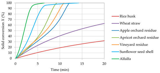 Substantial variation between biomasses is noted due to a factor of almost 50 between average reactivities of rice husk—slowest sample to be gasified at 1.2%·min−1—and alfalfa—fastest sample to be gasified at 54.7%·min−1.