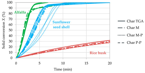 For each biomass, chars prepared in different conditions—in particular LHR pyrolysis conditions and not in a chemical regime—have the same reactivity during gasification. One exception for char M-P comes from the sunflower seed shells. No explanation was found regarding this result but it may be found by characterizing the chars. However, variations are negligible compared to differences that are observed between fast-reacting and slow-reacting biomass types. There is a factor of 1.2 in average between reactivities of the various char samples from each biomass, which is very low when compared to the factor of almost 50 calculated between reactivities of rice husk and alfalfa.