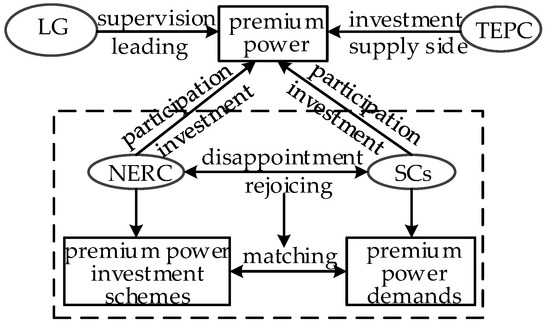 Premium power demands of high-tech manufacturers (HTMs) and the corresponding investment are not only related to SCs and TEPC, but also the LG who benefits from the taxation and development of local economy and industries. Therefore, premium power stakeholders involve LG, TEPC and SCs. From the perspective of benefit, SCs are the direct gainers, while the LG is the second gainer who gets the indirect benefits from the taxation and economic structure optimization. The TEPC get the more indirect benefits from the realization of enterprise image and social value. Under the condition of traditional electricity price policy, it is difficult for the TEPC to get direct benefits by providing premium power, because HTMs’ demands for power quality are high and the actual electric power consumption cost occupies only a small proportion of the production cost. Therefore, under the background of the opening of electric retail side, taking advantage of the economic and market mechanism, the combination of the TEPC and the third-party independent electric retail company together to form a NERC is necessary. On one hand, the TEPC is responsible for network optimization, better operations and optimization of the power grid’s power quality level on the grid side. On the other hand, as a part of NERC, the TEPC work together with the third-party independent retail company to invest in premium power. Under such a condition, a joint participation of LG, TEPC, SCs, and NERC in the premium power investment is a promising strategy. The multi-participant premium power investment strategy is shown in Figure 1.