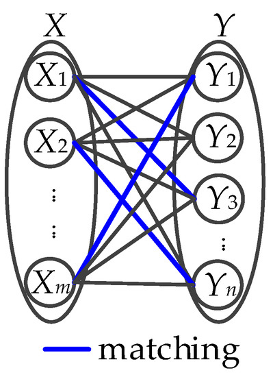 In order to make the above multi-objective function clearer, an example is given here. Assume that Xi is matched with Yj, we can obtain that xij = 1, xil = 0 (l = 1, 2, …, j − 1, j + 1, …, n), thus, Equation (12) can be obtained. If Yj is matched with Xi, we can obtain that xij = 1, xkj = 0 (k = 1, 2, …, i − 1, i + 1, …, m), but if Yj is not matched with any element of X, xkj = 0 (k = 1, 2, …, i − 1, i, i + 1, …, m), thus, Equation (13) can be obtained.