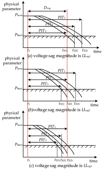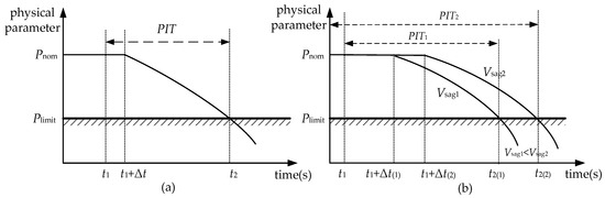 Considering that different equipment connected in series or parallel to form different processes, the process immunity time (PIT) curve [18] can be used as an example to characterize the immunity level of sensitive processes. PIT is usually used to characterize the variation of physical parameters after industrial processes encounter voltage sags. PIT is the duration of the physical parameter changing from rated value to an acceptable threshold value, when the industrial process has undergone a voltage sag, shown in Figure 3. and are the normal and the limited physical parameters. is the start time of voltage sag, is the response time delay, and is the instant when the physical parameter is smaller than . In Figure 3a, . It is clear from Figure 3b that the values of PIT are different when the voltage sag magnitudes are different.